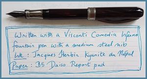 This blog post was drafted with pen and paper. For a history of Jacques Herbin wax and inks, originally founded in 1670 see here. Kyanite du Népal has a beautiful silver shimmer which is hard to photograph. The fabulously named Visconti Comedia inferno (brown with shimmering red swirls and highlights) is also difficult to capture here. The Visconti site provides better photographs.
